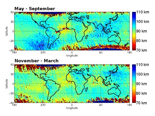 DEMETER avait un mode survey qui calculait à bord le spectre du champ électrique dans la gamme TBF (0 - 20 kHz) tout autour de la Terre avec une résolution temporelle de ~ 2 s et une résolution fréquentielle de ~ 20 Hz. La fréquence de coupure a été automatiquement déterminée à partir des intensités spectrales et la hauteur de l'ionosphère a été étudiée en fonction des saisons et des années dans la période décroissante du cycle solaire. On a ainsi montré que la hauteur de l'ionosphère n'était pas la même au-dessus des océans et des continents comme le montre la carte ci-dessous.