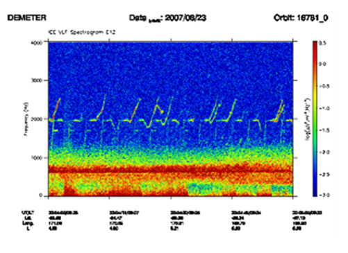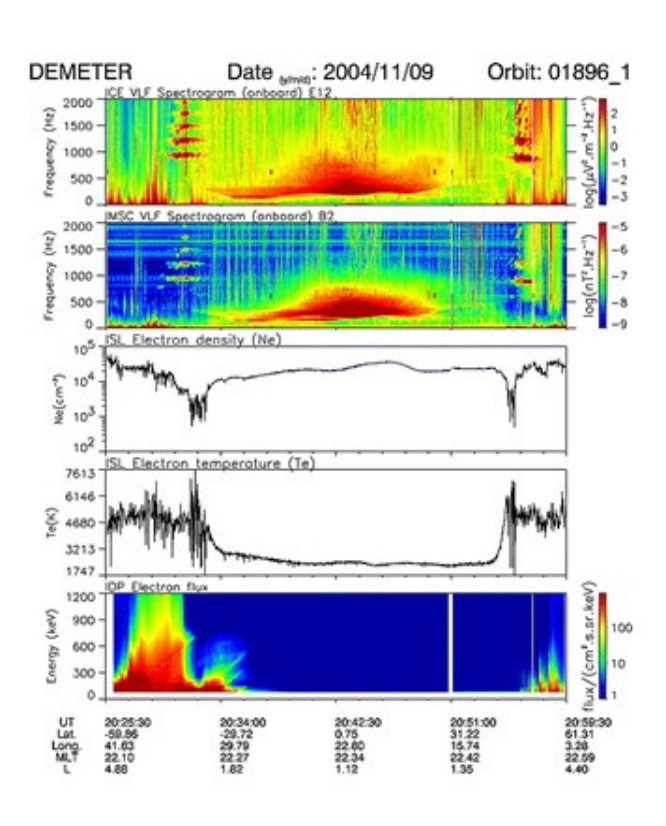 Enfin la comparaison simultanée des spectrogrammes TBF où l'on voit la signature des éclairs atmosphériques avec les données du détecteur de particules IDP a permis de mettre en évidence la précipitation des particules contenues dans les ceintures de radiation par les ondes qui sont émises par les éclairs et qui se propagent d'un hémisphère à l'autre le long des lignes de force du champ magnétique, comme le montre l’étude de Inan et al., (2007), DEMETER satellite observations of lightning-induced electron precipitation.