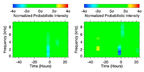 Dans les images qui suivent, les deux premiers diagrammes correspondent au champ électrique mesuré de nuit pour des tremblements de terre de magnitude supérieure à 4.8 (à gauche) et à 5 (à droite), de profondeur inférieure à 40 km, et une distance avec l'épicentre inférieure à 3° (les répliques n'ont pas été prises en compte). Les diagrammes montrent une diminution de l'intensité des ondes mesurées par DEMETER (d'autant plus forte que la magnitude est plus grande) dans une gamme de fréquence entre 1 et 2 kHz qui commence à avoir lieu quelques heures avant les séismes. Le troisième diagramme présente les mêmes résultats mais en fonction de la distance avec l'épicentre.
