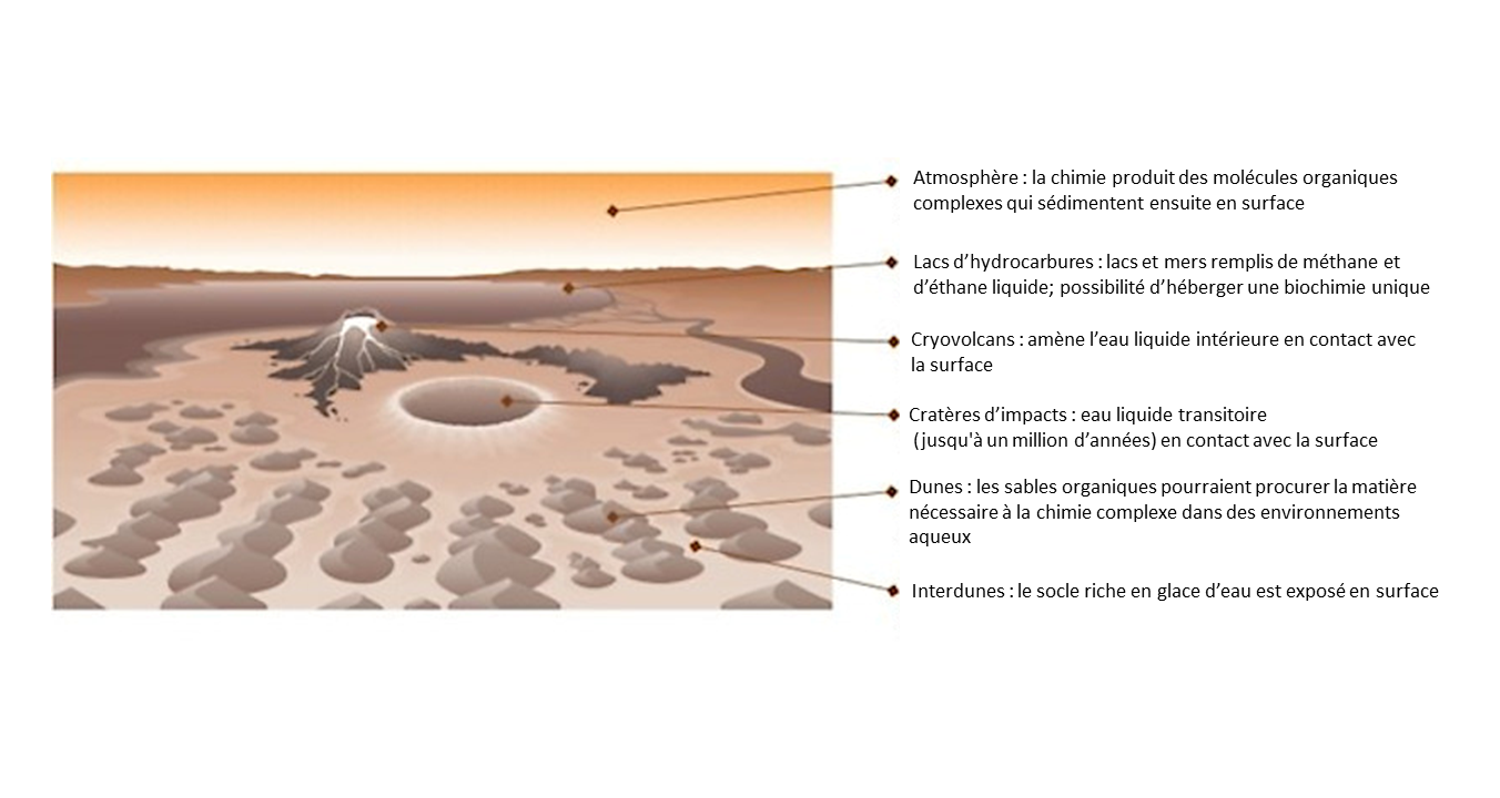 L’intérêt scientifique de Titan pour la connaissance du système solaire et l’exobiologie n’est plus à démontrer, surtout depuis la moisson de données collectées par la mission Cassini/Huygens (2004-2017). La descente de la sonde européenne Huygens dans les brumes très opaques entourant Titan a révélé des paysages finalement assez différents de ceux observés sur d’autres satellites du système solaire : la surface de Titan est peu cratérisée, ses reliefs sont modérés, et la glace d’eau semble en être presque absente.