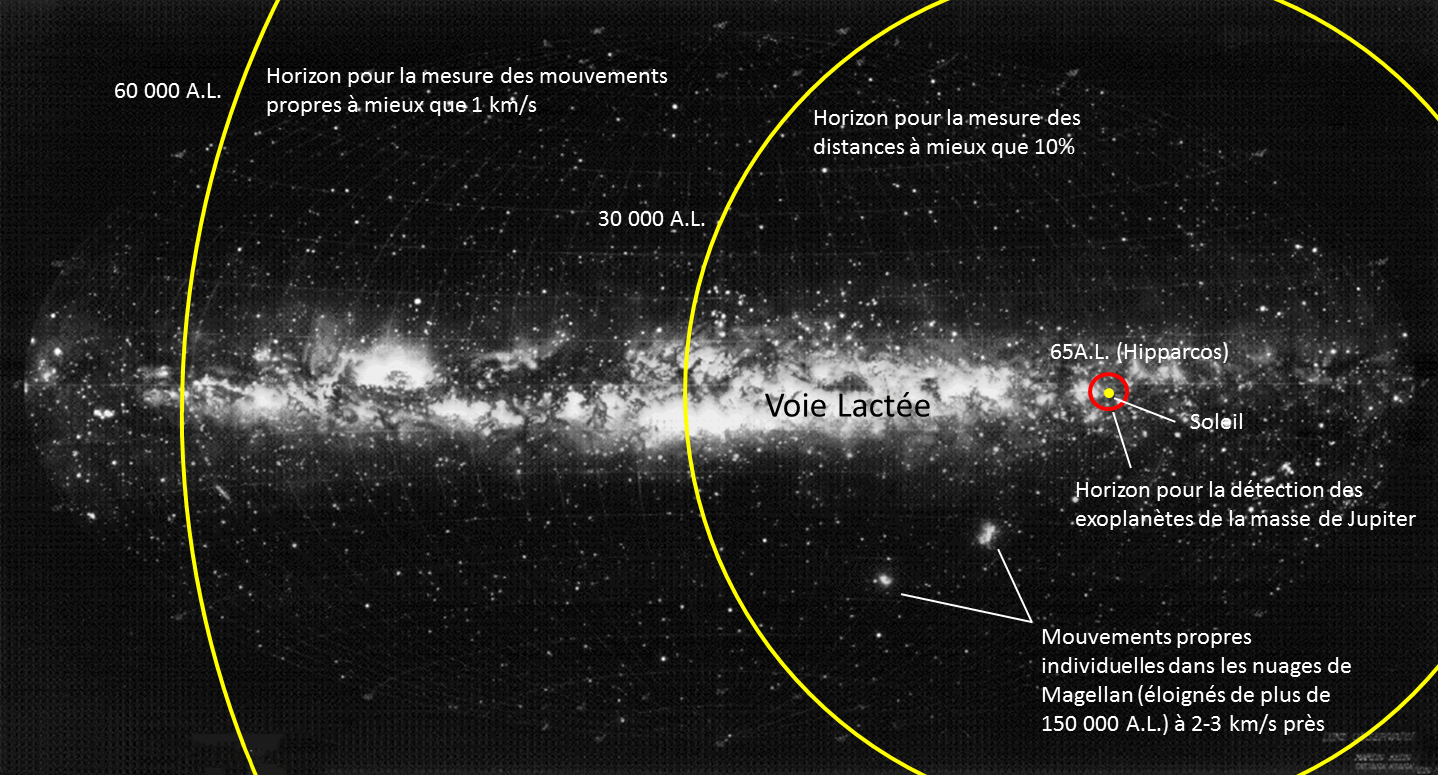 Gaia est une mission d'astrométrie qui s’inscrit dans le prolongement d’Hipparcos. Ce satellite, lancé en 1989, a permis de localiser 120 000 étoiles avec une résolution de 1 milliseconde d’arc. Gaia fait 10 000 fois mieux en quantité, et 100 fois mieux en précision.