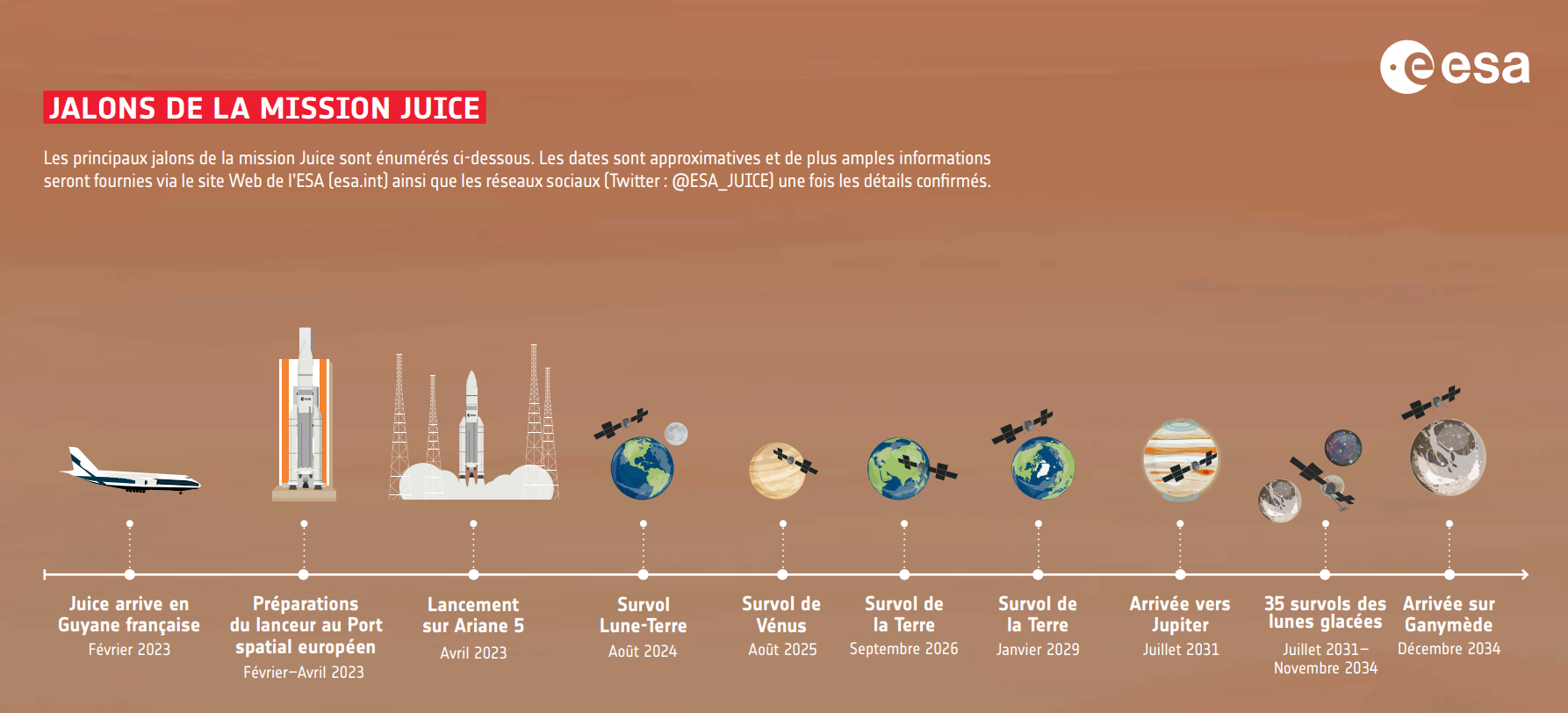 L'ESA assure la maîtrise d'ouvrage du projet JUICE. L'ESA est responsable du lancement, de la navigation vers Jupiter et de l'injection en orbite autour de Jupiter.