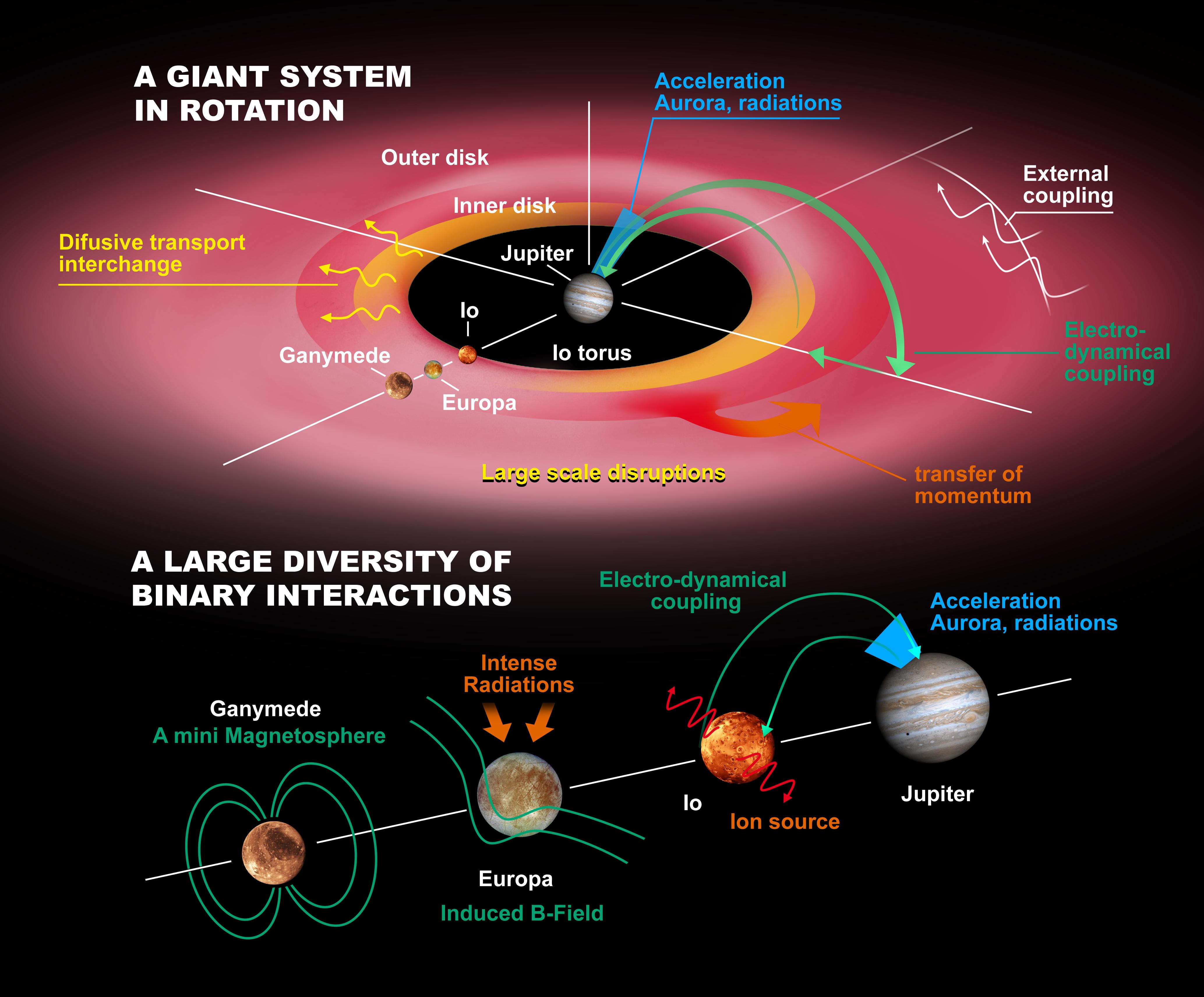 - Etude des champs magnétiques intrinsèque (Ganymède uniquement) et induit et de leurs interactions avec la magnétosphère jovienne