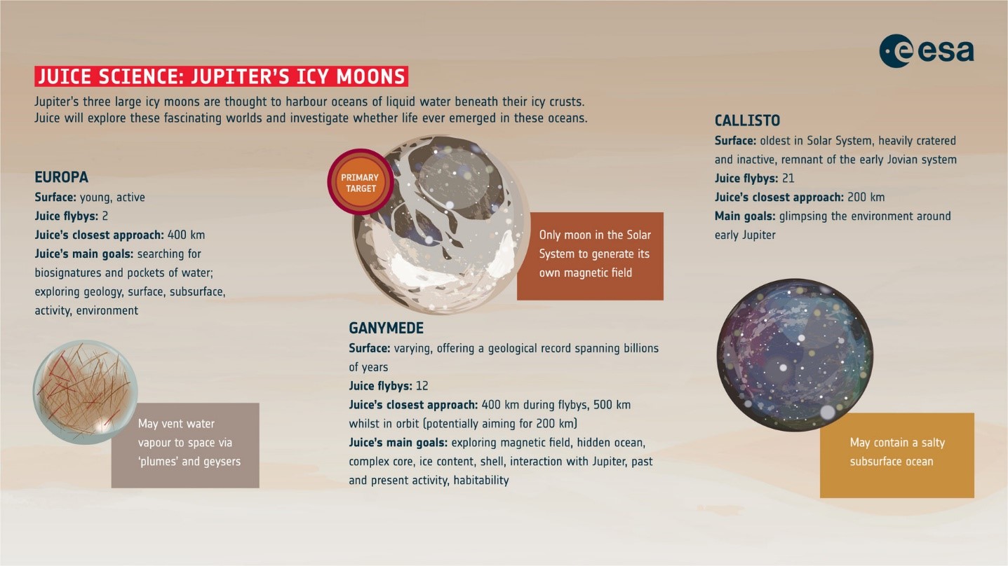 La mission JUICE étudiera de façon détaillée Jupiter et son système dans toutes ses interactions et complexités, en mettant particulièrement l'accent sur Ganymède en tant que lune glacée possédant un océan sous une croûte de glace potentiellement habitable et pourvue d’un champ magnétique intrinsèque. Les observations d'Europe et Callisto complèteront l’étude des lunes galiléennes.