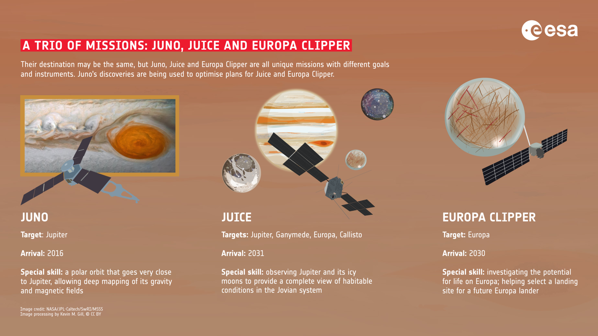 Lancé mi-avril 2023 par un lanceur Ariane 5, la mission JUpiter ICy moons Explorer (JUICE), arrivera vers Jupiter en juillet 2031, après de multiples assistances gravitationnelles de Vénus et de la Terre. L'insertion en orbite autour de Jupiter (Jupiter Orbit Insertion : JOI) sera le début d'une phase d'étude du système jovien (la planète Jupiter, sa magnétosphère et deux satellites galiléens : Europe et Callisto) qui durera 2,5 ans. Suivra une phase de 8 mois en orbite autour de Ganymède, où des phases en orbites elliptiques et circulaires d'observations scientifiques sont programmées afin de répondre à tous les objectifs de la mission.