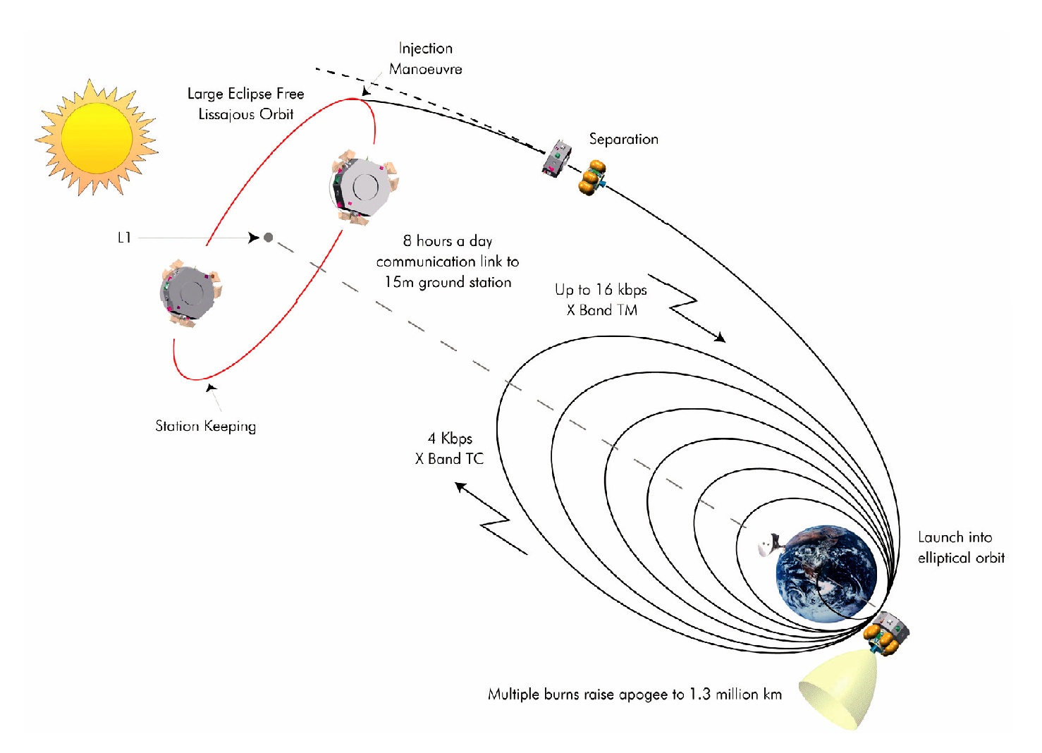 Cette orbite Lissajous, d'une période de 180 jours, a nécessité des manœuvres périodiques de maintien à poste - revenant à 1,8 m/s par an - ce qui a été fait en utilisant les propulseurs à gaz froid qui constituaient le système de micro-propulsion du satellite.