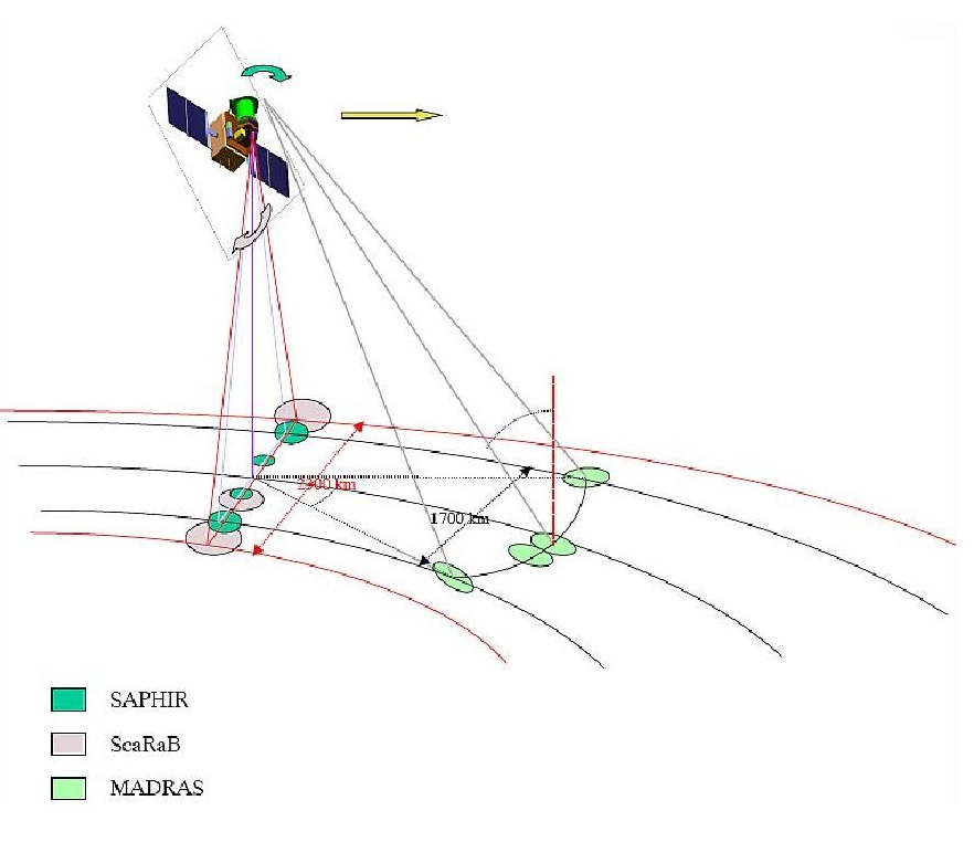 SAPHIR et ScaRaB étaient des scanneurs radiomètres à trace perpendiculaire : la trace au sol du scanneur était perpendiculaire à la trace au sol du satellite et le pixel grossissait avec l'angle de scan.