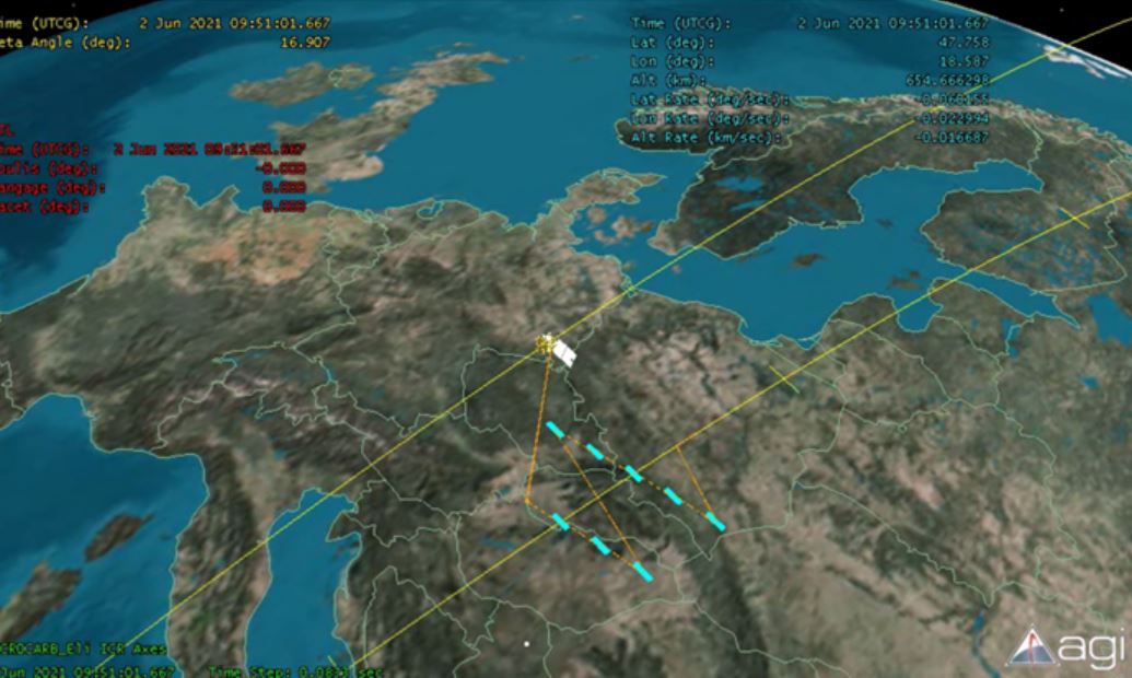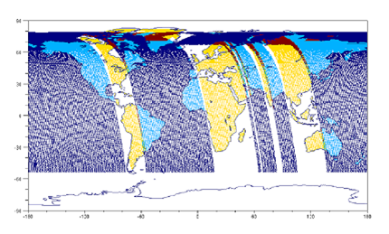 La figure ci-dessus montre une répartition des modes glint et nadir envisagée pour les études de dimensionnement du satellite en phase A. Les orbites en bleu sont en mode glint (orbites majoritairement sur mer), et les orbites en jaune sont en mode nadir (les mesures en mode nadir au-dessus des mers sont inexploitables, car le flux reçu par le satellite est trop faible). Une même orbite peut également être découpée entre une partie en glint et une partie en nadir. Le pointage en glint est assuré par le satellite pour le mouvement en tangage et par le mécanisme de scan interne à l’instrument pour le mouvement en roulis.