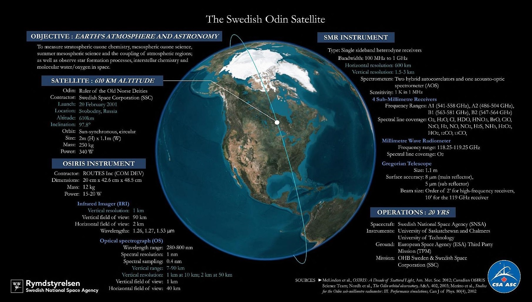 Le satellite Odin a été lancé le 20 février 2001 par un lanceur Start-1 depuis le cosmodrome de Svobodny en Russie. La mission initiale était de 2 ans et a été prolongée plusieurs fois.