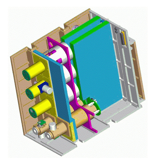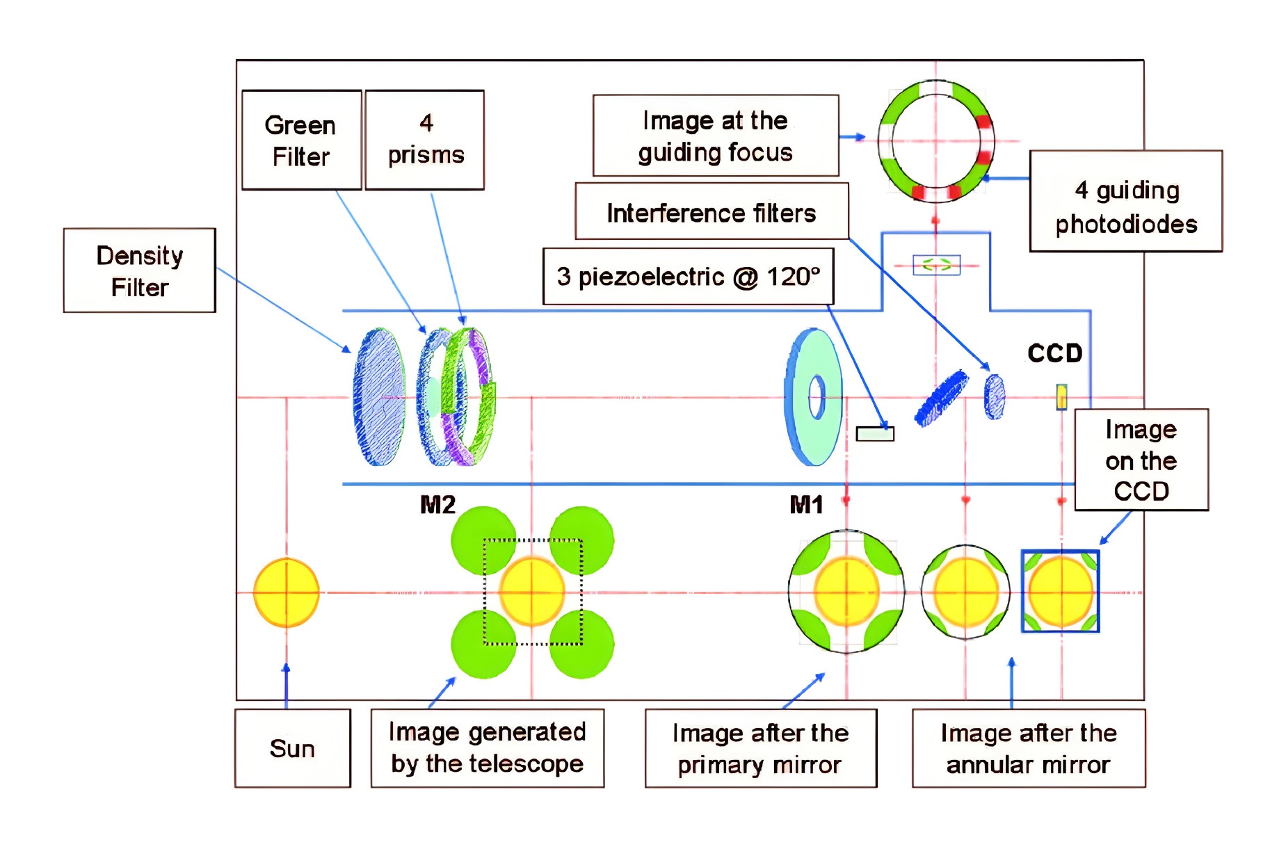 Après une fenêtre d'entrée qui limite à 5% l'énergie pénétrant dans l'instrument, on obtenait une image du soleil sur le détecteur CCD grâce à un télescope de type Cassegrain (image jaune). Les photons solaires étaient spectralement sélectionnés grâce à des filtres interférentiels placés sur un mécanisme mobile. Un obturateur non représenté sur la figure définissait le temps d'exposition. Pour contrôler la stabilité de l'instrument, un système de quatre prismes était placé derrière la lame d'entrée. Il fournissait quatre images secondaires dans chaque coin du détecteur. Un point du limbe de cette image et son correspondant dans l'image secondaire étaient séparés sur le CCD d'un nombre de pixels qui ne dépendait que de l'angle du prisme et de la température. Un filtre interférentiel évitait les effets chromatiques. Une partie du faisceau correspondant était interceptée et se plaçait sur quatre diodes qui permettaient de centrer l'image solaire sur le CCD en agissant sur la position du miroir primaire.