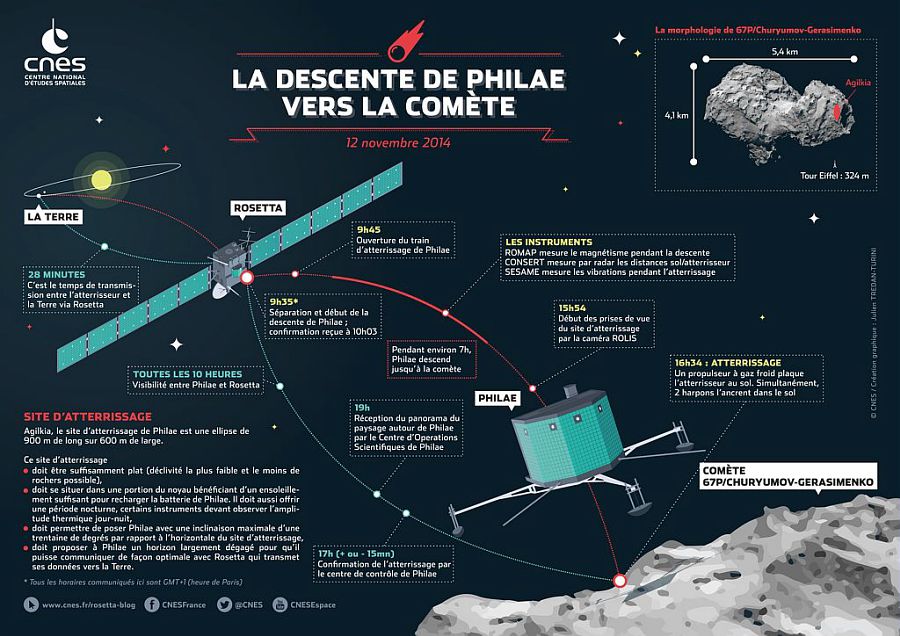 Le 12 novembre 2014, l'orbiteur a amené l'atterrisseur à son point de séparation. Quelques heures plus tard Philae s’est posé sur la comète et a réalisé ses 3 jours de la première séquence scientifique sur pile.