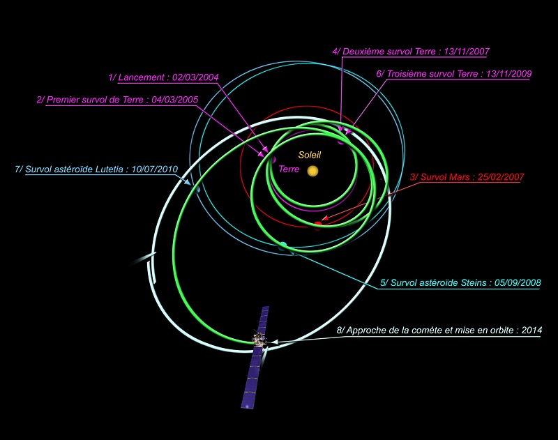 Afin de rejoindre sa cible, la sonde Rosetta a été placée sur une trajectoire faisant appel à quatre assistances gravitationnelles (Terre, Mars, Terre, Terre) permettant de modifier sa trajectoire initiale sans dépense excessive d'ergols.