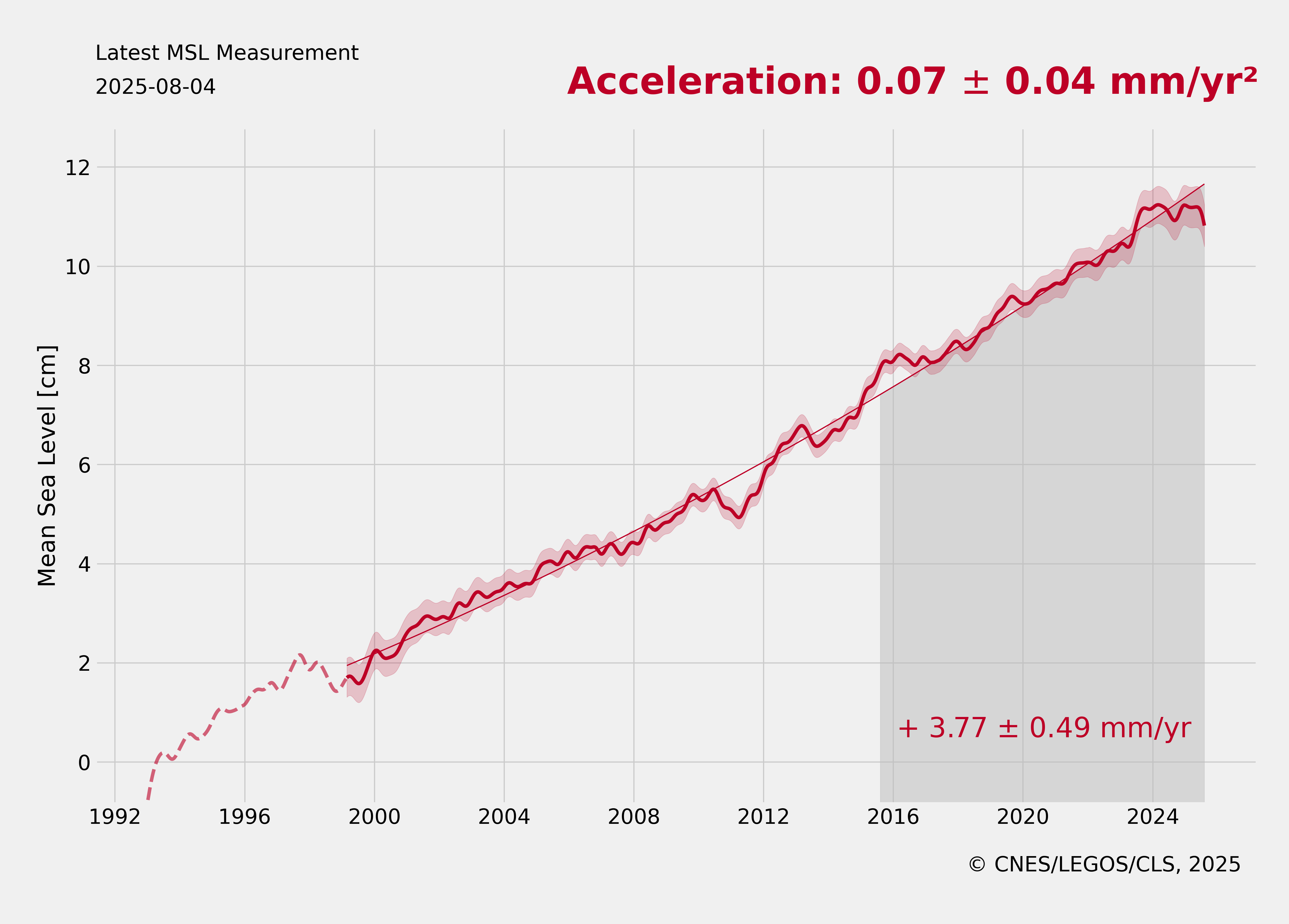 - Enfin, sur le long terme il est possible de suivre le niveau moyen des mers. Depuis le début de la mission Topex/Poseidon en 1992, une augmentation moyenne globale du niveau de la mer d'environ 3.6 mm/an est observée avec une accélération du phénomène ces dernières années. On remarque aussi une forte variabilité spatiale (jusqu'à ± 20 mm/an selon les régions). Cette augmentation est un des indicateurs du dérèglement climatique, et donc à ce titre un enjeu majeur des missions d'altimétrie est de maintenir la continuité et la précision de cette mesure.