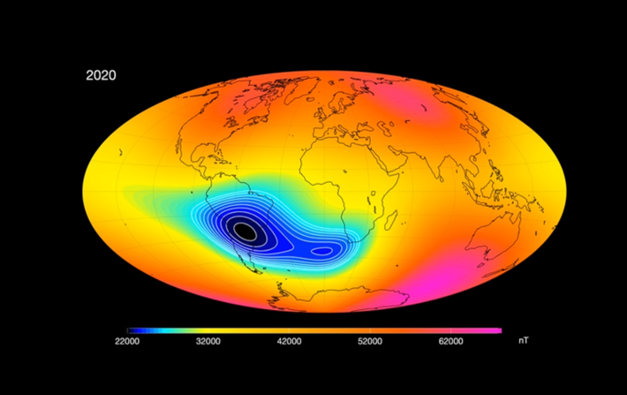 Les données recueillies par la mission SWARM de l'ESA ont confirmé une tendance à l'affaiblissement du champ magnétique terrestre, notamment dans l'hémisphère occidental. Une vaste région d'intensité magnétique réduite, connue sous le nom d'Anomalie de l'Atlantique Sud, s'est développée entre l'Afrique et l'Amérique du Sud. De 1970 à 2020, l'intensité minimale du champ dans cette zone est passée d'environ 24 000 nanoteslas à 22 000, et la zone de l'anomalie s'est déplacée vers l'ouest à un rythme d'environ 20 km par an. Au cours des cinq dernières années, un deuxième centre d'intensité minimale a émergé au sud-ouest de l'Afrique, suggérant que l'anomalie pourrait se diviser en deux cellules distinctes.