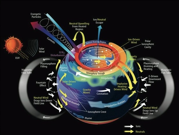 La région de l'espace dominée par le champ magnétique de la Terre est appelée la magnétosphère, où des processus complexes médiatisent le transfert d'énergie entre le vent solaire et le système terrestre, régulant, entre autres, l'apparition de l'aurore.