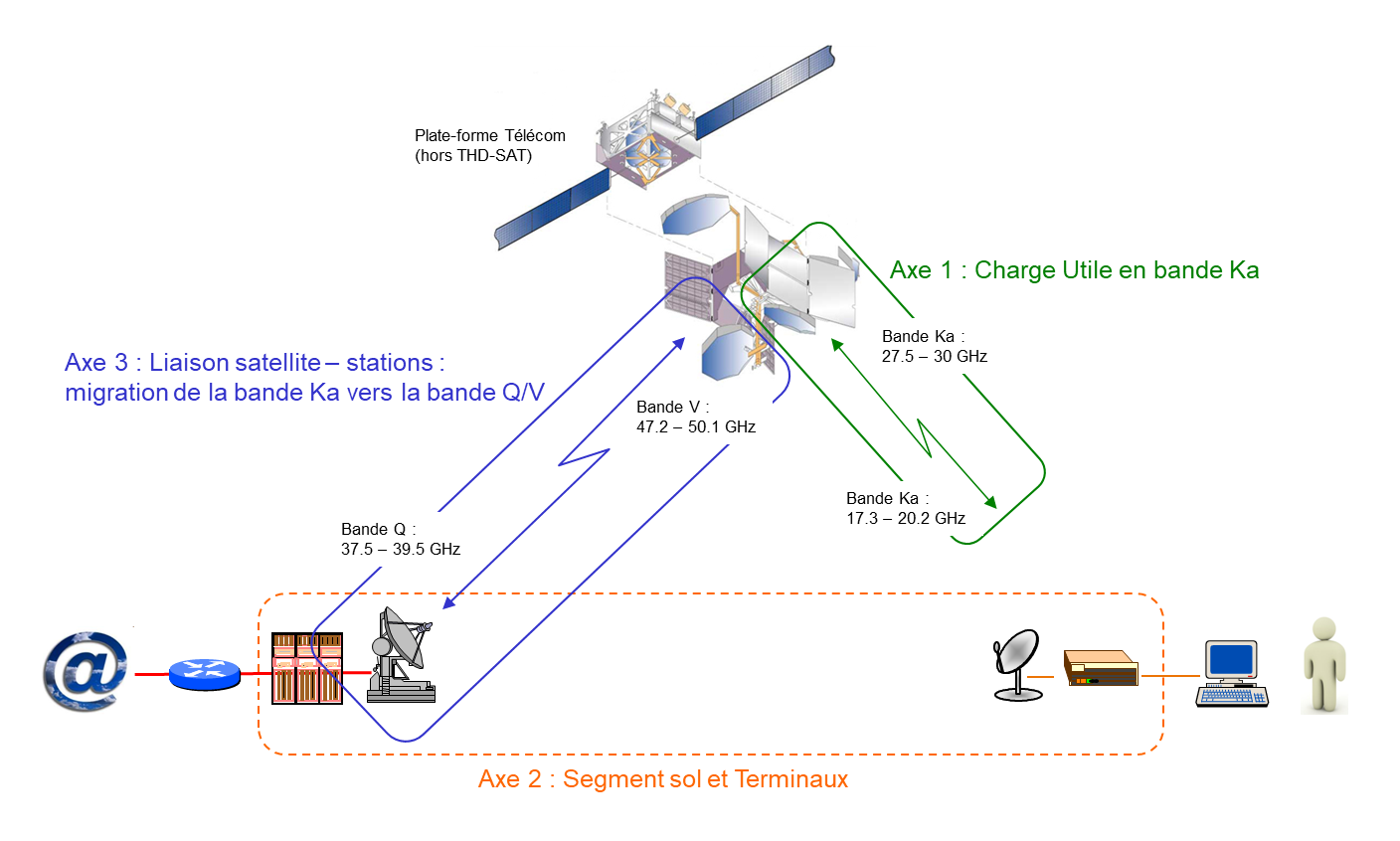 - Axe 3 - Liaison satellite – stations : migration de la liaison satellite – stations de connexion de la bande Ka vers la bande Q/V afin de réserver la bande Ka aux liaisons avec les utilisateurs